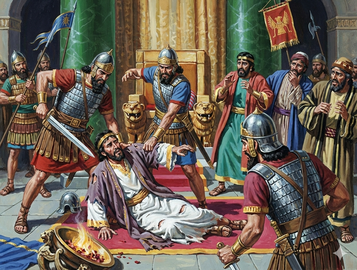 “여호야긴이 왕이 될 때에 나이가 십팔 세라 예루살렘에서 석 달간 다스리니라 그의 어머니의 이름은 느후스다요 예루살렘 엘라단의 딸이더라. 여호야긴이 그의 아버지의 모든 행위를 따라서 여호와께서 보시기에 악을 행하였더라. 그 때에 바벨론의 왕 느부갓네살의 신복들이 예루살렘에 올라와서 그 성을 에워싸니라 그의 신복들이 에워쌀 때에 바벨론의 왕 느부갓네살도 그 성에 이르니 유다의 왕 여호야긴이 그의 어머니와 신복과 지도자들과 내시들과 함께 바벨론 왕에게 나아가매 왕이 잡으니 때는 바벨론의 왕 여덟째 해이라. 그가 여호와의 성전의 모든 보물과 왕궁 보물을 집어내고 또 이스라엘의 왕 솔로몬이 만든 것 곧 여호와의 성전의 금 그릇을 다 파괴하였으니 여호와의 말씀과 같이 되었더라.” (8-13)