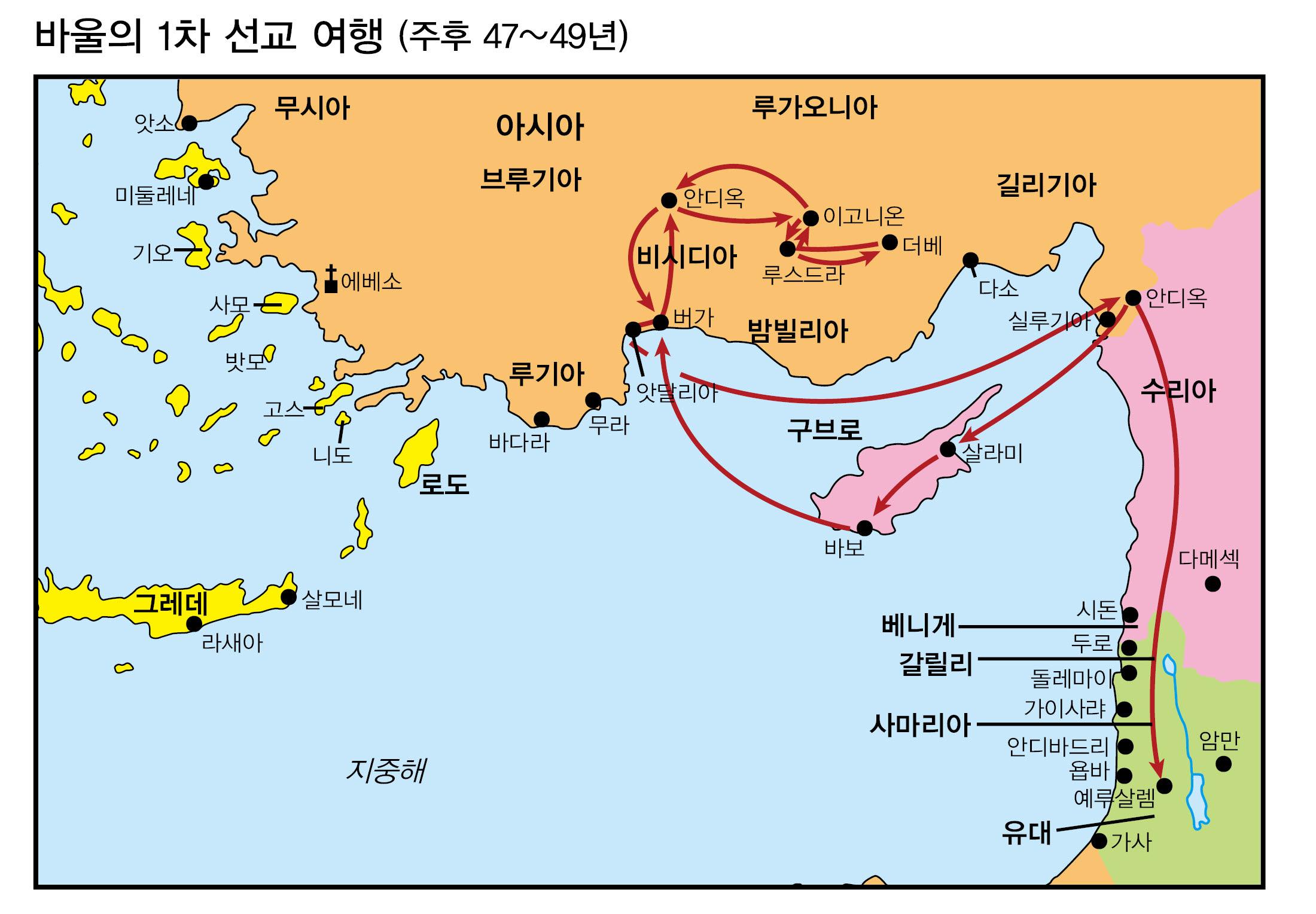 “비시디아 가운데로 지나서 밤빌리아에 이르러 말씀을 버가에서 전하고 앗달리아로 내려가서 거기서 배 타고 안디옥에 이르니 이 곳은 두 사도가 이룬 그 일을 위하여 전에 하나님의 은혜에 부탁하던 곳이라. 그들이 이르러 교회를 모아 하나님이 함께 행하신 모든 일과 이방인들에게 믿음의 문을 여신 것을 보고하고 제자들과 함께 오래 있으니라.” (24-28)